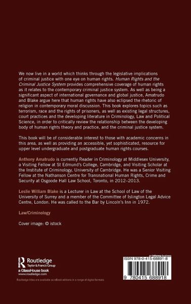 We now live in a world which thinks through the legislative implications of criminal justice with one eye on human rights. Human Rights and the Criminal Justice System provides comprehensive coverage of human rights as it relates to the contemporary criminal justice system. As well as being a significant aspect of international governance and global justice, Amatrudo and Blake argue here that human rights have also eclipsed the rhetoric of religion in contemporary moral discussion. This book explores topics such as terrorism, race, and the rights of prisoners, as well as existing legal structures, court practices, and the developing literature in Criminology, Law and Political Science, in order to critically review the relationship between the developing body of human rights theory and practice, and the criminal justice system. This book will be of considerable interest to those with academic concerns in this area; as well as providing an accessible, yet sophisticated, resource for upper level undergraduate and postgraduate human rights courses.