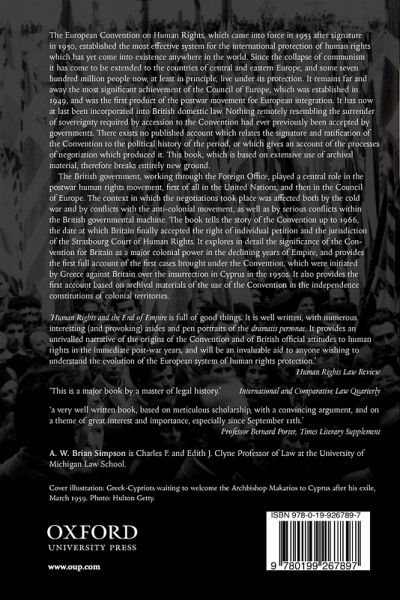 The British government, working through the Foreign Office, played a central role in the postwar human rights movement, first of all in the United Nations, and then in the Council of Europe; the context in which the negotiations took place was affected both by the cold war and by conflicts with the anti-colonial movement, as well as by serious conflicts within the British governmental machine. The book tells the story of the Convention up to 1966, the date at which British finally accepted the right of individual petition and the jurisdiction of the Strasbourg Court of Human Rights. It explores in detail the significance of the Convention for Britain as a major colonial power in the declining years of Empire, and provides the first full account of the first cases brought under the Convention, which were initiated by Greece against Britain over the insurrection in Cyprus in the 1950s. It also provides the first account based on archival materials of the use of the Convention in the independence constitutions of colonial territories.