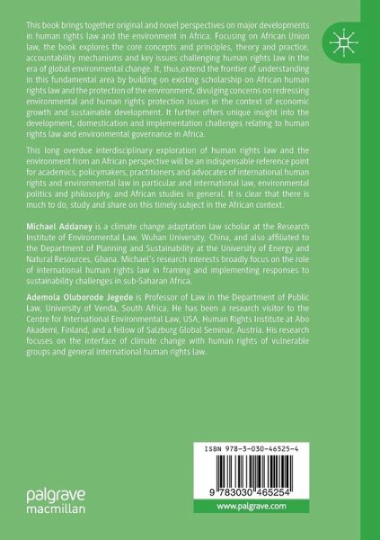 This book brings together original and novel perspectives on major developments in human rights law and the environment in Africa. Focusing on African Union law, the book explores the core concepts and principles, theory and practice, accountability mechanisms and key issues challenging human rights law in the era of global environmental change. It, thus, extend the frontier of understanding in this fundamental area by building on existing scholarship on African human rights law and the protection of the environment, divulging concerns on redressing environmental and human rights protection issues in the context of economic growth and sustainable development. It further offers unique insight into the development, domestication and implementation challenges relating to human rights law and environmental governance in Africa.