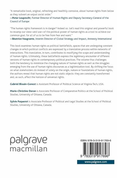 This book examines human rights as political battlefields, spaces that are undergoing constant changes in which political conflicts are expressed by a translation process within networks of interactions. This translation, in turn, contributes to modifying the scope and understanding of human rights. Ultimately, these battlefields express the legitimacy encounter of different versions of human rights in contemporary political practices. The volume thus challenges both the tendency to minimize the changing nature of human rights as well as the struggles emerging from the use of human rights discourses as a legitimization tool. By shifting the focus on what stakeholders do instead of solely on the origin, nature or foundations of human rights, the authors reveal that human rights are not static objects: they are constantly transformed and, as such, affect the horizon of universal rights.