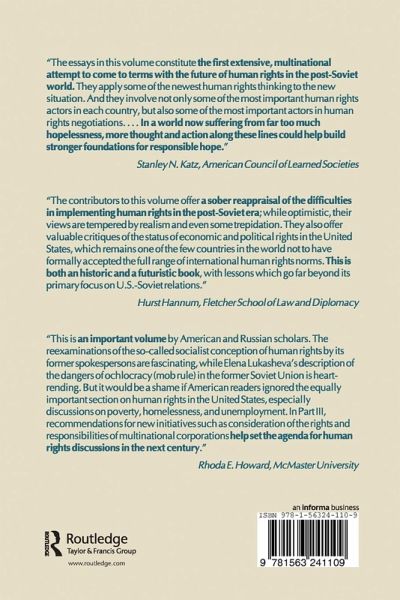 Leading specialists and activists from Russia and the USA join, in this volume, to offer a searching assessment of human rights in their own countries and in the world at large. They reflect on past history, present problems associated with system breakdown and decline, and the obstacles and opportunities on the way to the realisation of human rights in this uncertain post-Cold War era and the millennium that is now dawning. The participants in the discussions detailed here include Yelena Bonner, Viktor Chkhikvadze, Norman Dorsen, Riane Eisler, David Forsythe, Paula Garb, Charles Henry, Susan Heuman, Irina Lediakh, Vladimir Kudriavtsev, Pavel Litvinov, Richard Schifter, Henry Shue, Evgenii Skripilev, Vladimir Vlashihin, Oleg Vorobiev and the editors.
