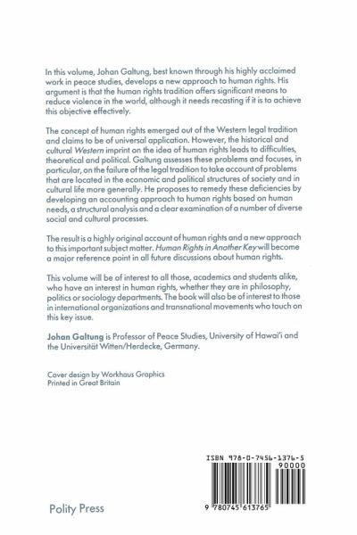 In this volume, Johan Galtung, best known through his highly acclaimed work in peace studies, develops a new approach to human rights. His argument is that the human rights tradition offers significant means to reduce violence in the world, although it needs recasting if it is to achieve this objective effectively. The concept of human rights emerged out of the Western legal tradition and claims to be of universal application. However, the historical and cultural Western imprint on the idea of human rights leads to difficulties, theoretical and political. Galtung assesses these problems and focuses, in particular, on the failure of the legal tradition to take account of problems that are located in the economic and political structures of society and in cultural life more generally. He proposes to remedy these deficiencies by developing an accounting approach to human rights based on human needs, a structural analysis, and a clear examination of diverse social and cultural processes. The result is a highly original account of human rights and a new approach to this important subject matter. Human Rights in Another Key will become a major reference point in all future discussions about human rights.