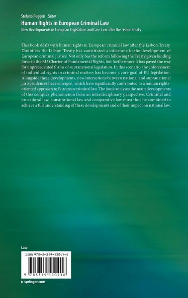 This book deals with human rights in European criminal law after the Lisbon Treaty. Doubtless the Lisbon Treaty has constituted a milestone in the development of European criminal justice. Not only has the reform following the Treaty given binding force to the EU Charter of Fundamental Rights, but furthermore it has paved the way for unprecedented forms of supranational legislation. In this scenario, the enforcement of individual rights in criminal matters has become a core goal of EU legislation. Alongside these developments, new interactions between national and supranational jurisprudences have emerged, which have significantly contributed to a human rights-oriented approach to European criminal law. The book analyses the main developments of this complex phenomenon from an interdisciplinary perspective. Criminal and procedural law, constitutional law and comparative law must thus be combined to achieve a full understanding of these developments and of their impact on nationallaw.
