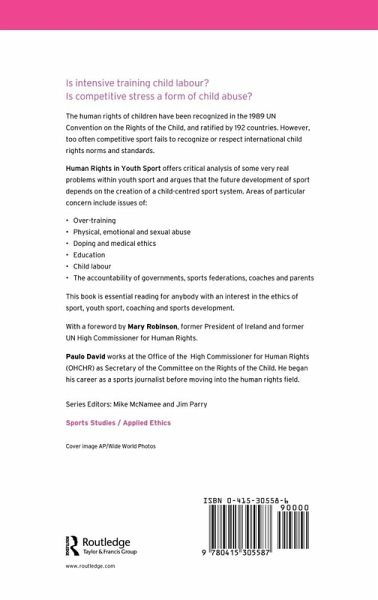 Does competitive sport respect children's human rights? Is intensive training child labour? Is competitive stress a form of child abuse? The human rights of children have been recognized in the 1989 UN Convention on the Rights of the Child, and ratified by 192 countries. Paulo David's work makes it clear, however, that too often competitive sport fails to recognize the value of respect for international child rights norms and standards. Human Rights in Youth Sport offers critical analysis of some very real problems within youth sport and argues that the future development of sport depends on the creation of a child-centred sport system. Areas of particular concern include issues of: over-training physical, emotional and sexual abuse doping and medical ethics education child labour accountability of governments, sports federations, coaches and parents. The text will be essential reading for anybody with an interest in the ethics of sport, youth sport, coaching and sports development.