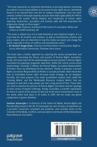 This book takes a holistic approach by capturing the various perspectives and viewpoints concerning the theory and practice of Human Rights Journalism. Firstly, this book helps fill the epistemological vacuum present in Human Rights Journalism by proposing 'pragmatic objectivity' within the critical constructivist epistemology. Secondly, it defines the Human Rights Journalism-Responsibility to Protect nexus by identifying five key elements. Thirdly, it proposes a Human Rights Journalism-Responsibility to Protect conceptual model, which illustrates how an embedded human rights focussed media strategy can be designed. Fourthly, this book proposes two novel quantitative analysis tools called the 'Framing Matrix' and the 'Multimodal Discourse Analysis Matrix' that are equipped to deal with a big sample size over a long period of time. These tools are used to examine the practice of Human Rights Journalism and the typology of news stories of distant sufferings. Finally, it providesa scientific explanation for those in search of the answer to why one of the worst humanitarian crises in the world, which took place in Sri Lanka in 2009, did not create any global compassion or garner attention.