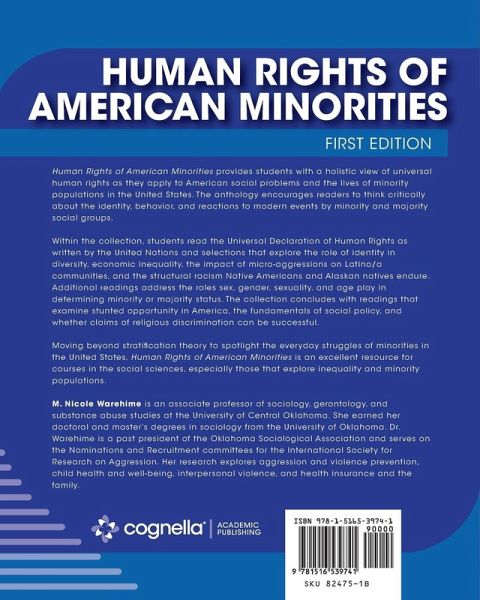 Human Rights of American Minorities provides students with a holistic view of universal human rights as they apply to American social problems and the lives of minority populations in the United States. The anthology encourages readers to think critically about the identity, behavior, and reactions to modern events by minority and majority social groups. Within the collection, students read the Universal Declaration of Human Rights as written by the United Nations and selections that explore the role of identity in diversity, economic inequality, the impact of micro-aggressions on Latino/a communities, and the structural racism Native Americans and Alaskan natives endure. Additional readings address the roles sex, gender, sexuality, and age play in determining minority or majority status. The collection concludes with readings that examine stunted opportunity in America, the fundamentals of social policy, and whether claims of religious discrimination can be successful. Moving beyond stratification theory to spotlight the everyday struggles of minorities in the United States, Human Rights of American Minorities is an excellent resource for courses in the social sciences, especially those that explore inequality and minority populations. M. Nicole Warehime is an associate professor of sociology, gerontology, and substance abuse studies at the University of Central Oklahoma. She earned her doctoral and master’s degrees in sociology from the University of Oklahoma. Dr. Warehime is a past president of the Oklahoma Sociological Association and serves on the Nominations and Recruitment committees for the International Society for Research on Aggression. Her research explores aggression and violence prevention, child health and well-being, interpersonal violence, and health insurance and the family.
