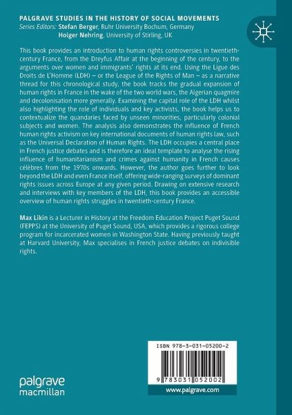 This book provides an introduction to human rights controversies in twentieth-century France, from the Dreyfus Affair at the beginning of the century, to the arguments over women and immigrants' rights at its end. Using the Ligue des Droits de L'Homme (LDH) - or the League of the Rights of Man - as a narrative thread for this chronological study, the book tracks the gradual expansion of human rights in France in the wake of the two world wars, the Algerian quagmire and decolonisation more generally. Examining the capital role of the LDH whilst also highlighting the role of individuals and key activists, the book helps us to contextualise the quandaries faced by unseen minorities, particularly colonial subjects and women. The analysis also demonstrates the influence of French human rights activism on key international documents of human rights law, such as the Universal Declaration of Human Rights. The LDH occupies a central place in French justice debates and is therefore an ideal template to analyse the rising influence of humanitarianism and crimes against humanity in French causes célèbres from the 1970s onwards. However, the author goes further to look beyond the LDH and even France itself, offering wide-ranging surveys of dominant rights issues across Europe at any given period. Drawing on extensive research and interviews with key members of the LDH, this book provides an accessible overview of human rights struggles in twentieth-century France.