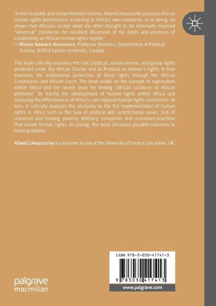 This book critically examines the civil, political, socioeconomic, and group rights protected under the African Charter and its Protocol on women's rights. It then examines the institutional protection of these rights through the African Commission and African Court. The book builds on the concept of regionalism within Africa and the recent drive for finding "African solutions to African problems" by tracing the development of human rights within Africa and assessing the effectiveness of Africa's core regional human rights institutions. In turn, it critically analyses the obstacles to the full implementation of human rights in Africa such as the lack of political will, jurisdictional issues, lack of resources and funding, poverty, illiteracy, corruption, and customary practices that violate human rights. In closing, the book discusses possible solutions to these problems.