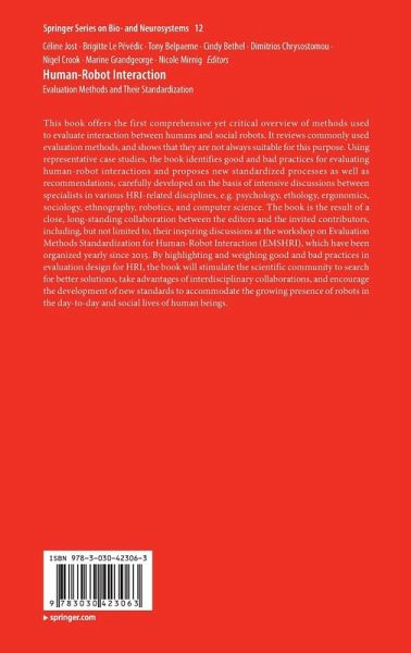 This book offers the first comprehensive yet critical overview of methods used to evaluate interaction between humans and social robots. It reviews commonly used evaluation methods, and shows that they are not always suitable for this purpose. Using representative case studies, the book identifies good and bad practices for evaluating human-robot interactions and proposes new standardized processes as well as recommendations, carefully developed on the basis of intensive discussions between specialists in various HRI-related disciplines, e.g. psychology, ethology, ergonomics, sociology, ethnography, robotics, and computer science. The book is the result of a close, long-standing collaboration between the editors and the invited contributors, including, but not limited to, their inspiring discussions at the workshop on Evaluation Methods Standardization for Human-Robot Interaction (EMSHRI), which have been organized yearly since 2015. By highlighting and weighing good and bad practices in evaluation design for HRI, the book will stimulate the scientific community to search for better solutions, take advantages of interdisciplinary collaborations, and encourage the development of new standards to accommodate the growing presence of robots in the day-to-day and social lives of human beings.