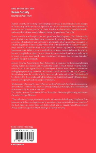 "Building upon the need for a more human-centered approach, the study of human security continues to mature into a serious area of dialogue and analysis as is so wonderfully demonstrated by the work in this book." Dr. Lloyd Axworthy, President and Vice-Chancellor of Winnipeg University and former Canadian Foreign Minister "This collection of essays presents the reader with new and challenging insights on how human security has been implemented in a number of issue areas in East Asian countries." Dr. Bert Edström, Senior Research Fellow, Institute for Security and Development Policy, author of Japan and the Challenge of Human Security