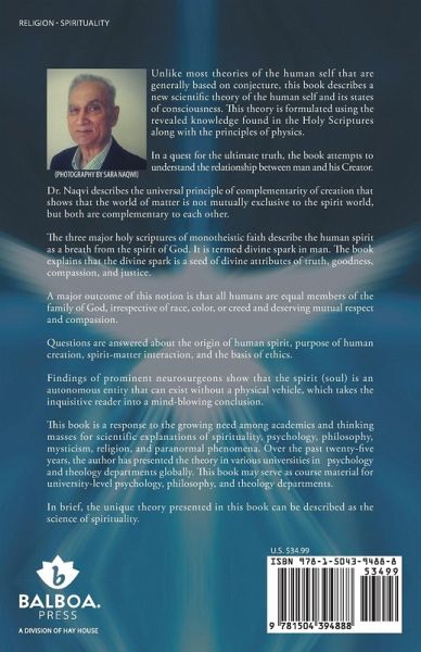 Unlike most theories of the human self that are generally based on conjecture, this book describes a new scientific theory of the human self and its states of consciousness. This theory is formulated using the revealed knowledge found in the Holy Scriptures along with the principles of physics. In a quest for the ultimate truth, the book attempts to understand the relationship between man and his Creator. Dr. Naqvi describes the universal principle of complementarity of creation that shows that the world of matter is not mutually exclusive to the spirit world, but both are complementary to each other. The three major holy scriptures of monotheistic faith describe the human spirit as a breath from the spirit of God. It is termed divine spark in man. The book explains that the divine spark is a seed of divine attributes of truth, goodness, compassion, and justice. A major outcome of this notion is that all humans are equal members of the family of God, irrespective of race, color, or creed and deserving mutual respect and compassion. Questions are answered about the origin of human spirit, purpose of human creation, spirit-matter interaction, and the basis of ethics. Findings of prominent neurosurgeons show that the spirit (soul) is an autonomous entity that can exist without a physical vehicle, which takes the inquisitive reader into a mind-blowing conclusion. This book is a response to the growing need among academics and thinking masses for scientific explanations of spirituality, psychology, philosophy, mysticism, religion, and paranormal phenomena. Over the past twenty-five years, the author has presented the theory in various universities in psychology and theology departments globally. This book may serve as course material for university-level psychology, philosophy, and theology departments. In brief, the unique theory presented in this book can be described as the science of spirituality.