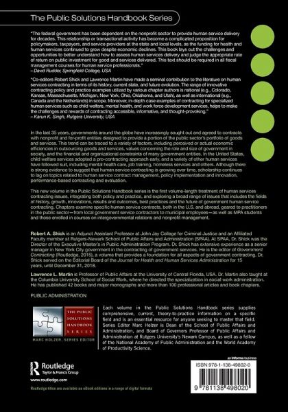 This new volumein the Public Solutions Handbook series is the first volume-length treatment of human services contracting issues, integrating both policy and practice, and exploring a broad range of issues that includes the fields of history, growth, innovations, results and outcomes, best practices and the future of government human service contracting. Chapters in this book examine specific human service contracts, both in the U.S. and abroad, geared to practitioners in the public sector-from local government service contractors to municipal employees-as well as MPA students and those enrolled in courses on intergovernmental relations and nonprofit management.