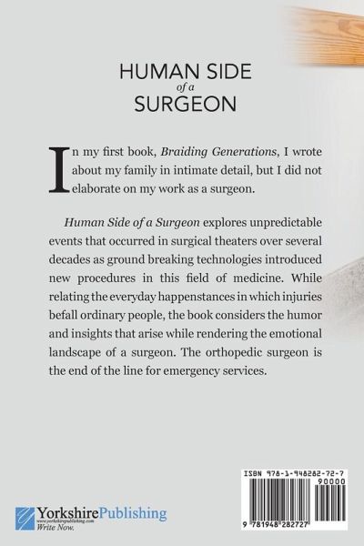 In my first book, Braiding Generations, I wrote about my family in intimate detail, but I did not elaborate on my work as a surgeon. Human Side of a Surgeon explores unpredictable events that occurred in surgical theaters over several decades as ground breaking technologies introduced new procedures in this field of medicine. While relating the everyday happenstances in which injuries befall ordinary people, the book considers the humor and insights that arise while rendering the emotional landscape of a surgeon. The orthopedic surgeon is the end of the line for emergency services.