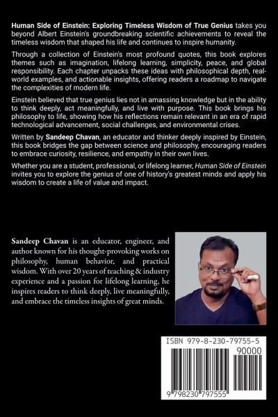 Human Side of Einstein: Exploring Timeless Wisdom of True Genius Albert Einstein is celebrated as one of the greatest scientific minds in history, but his profound reflections on life, humanity, and purpose extend far beyond the confines of physics. In Human Side of Einstein: Exploring Timeless Wisdom of True Genius, Sandeep Chavan delves into Einstein's timeless words, offering readers a deeper understanding of his philosophies and their relevance to modern life. This book is not a scientific treatise but an exploration of Einstein's humanistic insights. Each chapter unpacks one of his famous quotes, presenting it through the lenses of philosophy, psychology, and practical living. From the transformative power of imagination to the enduring value of simplicity, the chapters examine universal themes that resonate with readers from all walks of life. Chavan highlights Einstein's belief in selflessness, lifelong learning, and the responsibility of fostering peace and understanding in a divided world. The book addresses critical topics like the ethical use of technology, the importance of global collaboration, and the need for empathy in solving humanity's challenges. Through thoughtful reflections, real-world examples, and engaging exercises, readers are encouraged to apply Einstein's wisdom to their own lives, embracing a mindset of curiosity, resilience, and purpose. The title, Human Side of Einstein, reflects the book's intent to go beyond the equations and theories to reveal a compassionate, curious, and profoundly human thinker. Einstein's assertion that "In the middle of difficulty lies opportunity" serves as a guiding principle throughout the book, inspiring readers to view life's challenges as opportunities for growth and transformation. With a blend of philosophical depth and actionable insights, Human Side of Einstein invites readers to explore the essence of genius not as an extraordinary gift but as the capacity to think deeply, act meaningfully, and contribute to the betterment of the world. Whether you are a student, professional, or lifelong learner, this book offers timeless lessons to navigate an ever-changing world with clarity, integrity, and imagination. Through Einstein's lens, Chavan presents a roadmap for living thoughtfully and purposefully, ensuring that the genius of one man becomes a guiding light for humanity's collective journey.