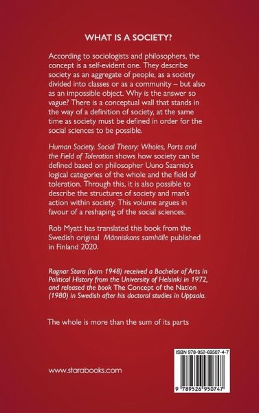 What is a society? According to sociologists and philosopher the concept is a self-evident one. They describe society as an aggregate of people, as a society divided into classes or as a community - but also as an impossible object. Why is the answer so vague? There is a conceptual wall that stands in the way of a definition of society, at the same time as society must be defined for the social sciences to be possible. The book shows how society can be defined based on philosopher Uuno Saarniös logical categories of the whole and the field of toleration from Leibniz. Through this, it is also possible to describe the structures of society and man¿s actions within society. This volume argues in favor of a reshaping of the social sciences. Rob Myatt has translated this book from the Swedish original published in Finland in 2020.