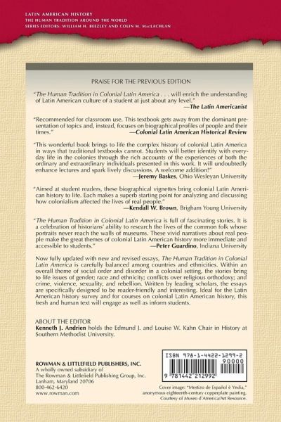 The Human Tradition in Colonial Latin America is an anthology of stories of largely ordinary individuals struggling to forge a life during the unstable colonial period in Latin America. These mini-biographies vividly show the tensions that emerged when the political, social, religious, and economic ideals of the Spanish and Portuguese colonial regimes and the Roman Catholic Church conflicted with the realities of daily living in the Americas. Now fully updated with new and revised essays, the book is carefully balanced among countries and ethnicities. Within an overall theme of social order and disorder in a colonial setting, the stories bring to life issues of gender; race and ethnicity; conflicts over religious orthodoxy; and crime, violence, and rebellion. Written by leading scholars, the essays are specifically designed to be readable and interesting. Ideal for the Latin American history survey and for courses on colonial Latin American history, this fresh and human text will engage as well as inform students. Contributions by: Rolena Adorno, Kenneth J. Andrien, Christiana Borchart de Moreno, Joan Bristol, Noble David Cook, Marcela Echeverri, Lyman L. Johnson, Mary Karasch, Alida C. Metcalf, Kenneth Mills, Muriel S. Nazzari, Ana María Presta, Susan E. Ramírez, Matthew Restall, Zeb Tortorici, Camilla Townsend, Ann Twinam, and Nancy E. van Deusen.