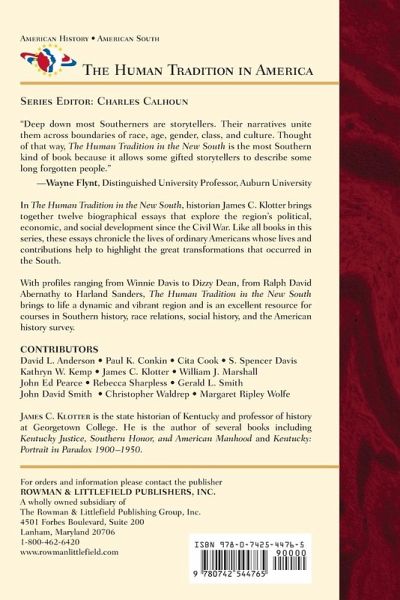 In The Human Tradition in the New South, historian James C. Klotter brings together twelve biographical essays that explore the region's political, economic, and social development since the Civil War. Like all books in this series, these essays chronicle the lives of ordinary Americans whose lives and contributions help to highlight the great transformations that occurred in the South. With profiles ranging from Winnie Davis to Dizzy Dean, from Ralph David Abernathy to Harland Sanders, The Human Tradition in the New South brings to life this dynamic and vibrant region and is an excellent resource for courses in Southern history, race relations, social history, and the American history survey.