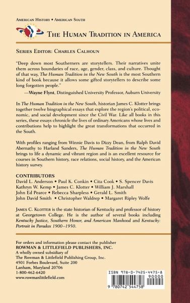 In The Human Tradition in the New South, historian James C. Klotter brings together twelve biographical essays that explore the region's political, economic, and social development since the Civil War. Like all books in this series, these essays chronicle the lives of ordinary Americans whose lives and contributions help to highlight the great transformations that occurred in the South. Including profiles ranging from Winnie Davis to Dizzy Dean, from Asa Candler to Harlan Sanders, the book brings to life this dynamic and vibrant region.