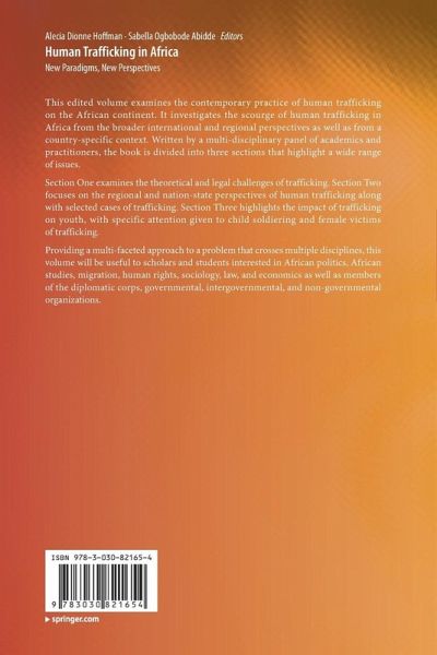 Section One: Theoreties, Protocols, and Policy Framework.- Chapter 1: Evaluation of the Narrative Paradigm and Knowledge Gap Theories in Interrogating Human Trafficking in the Nigerian Context.- Chapter 2: Extending the International Criminal Court's Jurisdiction to Corporate Entities.- Chapter 3: The African Union and the European Union: The Effectiveness of Legal Instruments to Curb Human Trafficking from Africa.- Chapter 4: Human Trafficking in Africa: Strategies for Combatting the Menace.- Chapter 5: A Legal Appraisal on Human Trafficking at Sea.- Chapter 6: Understanding Technology and Human Trafficking in Africa.- Chapter 7: How to Combat Human Trafficking on the Continent.- Section Two: Global and Regional Perspectives.- Chapter 8: Trafficking in Persons in Tunisia: Between Law and Reality, the View on the Situation of Women Victims of Transnational Trafficking".- Chapter 9: A Comprehensive Analysis of Global Human Trafficking-Spotlight on North African Region.- Chapter 10: Trafficking in Body Parts and Human Organs for Commercial Purposes in Africa.- Chapter 11: Human Trafficking and Tales of 'Backway' Returnees in the Gambia.- Chapter 12: Poverty and Human Trafficking: A Critical Analysis of Selected Nigerian Video Films.- Chapter 13: Human Trafficking and Violation of Girls' Rights to Education in Sub-Saharan Africa.- Chapter 14: Human Trafficking in Southern Africa.- Section Three: Child Soldiers and Female Victims.- Chapter 15: Sex Trafficking of Girls: The African Story and Experience.- Chapter 16: "Vidomegon" and the Intricacy of Child Exploitation and Trafficking in the Benin Republic.- Chapter 17: Child Soldiering and its Violence to Children and Humanity: The African Experience.- Chapter 18: The Menace of the Use of Child Soldiers in Conflicts: A New Threat to Regional Security in Africa.- Chapter 19: Child Soldiering in Somalia in the Context of Terrorism.- Index.