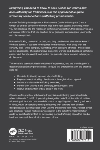 Introduction Part 1: Foundations 1. Perspective 2. The Big Picture 3. Building with the End in Mind 4. The Law 5. Working with Trafficking Victims Part 2: Nuts and Bolts 6. Generating Leads 7. Interviewing Victims 8. 8. Developing Evidence in CST Cases 9. Force, Fraud, and Coercion 10. Digital Evidence 11. Report Writing 12. Courtroom Testimony Part 3: Special Topics in Trafficking 13. Developing a Departmental Response 14. The Medical Forensic Exam 15. Immigration Remedies 16. Working with Victim Service Providers 17. Building an Effective Collaborative Conclusion