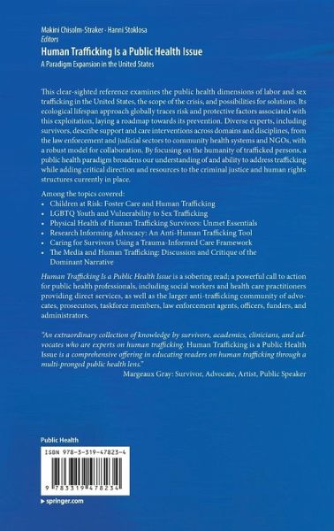 This clear-sighted reference examines the public health dimensions of labor and sex trafficking in the United States, the scope of the crisis, and possibilities for solutions. Its ecological lifespan approach globally traces risk and protective factors associated with this exploitation, laying a roadmap towards its prevention. Diverse experts, including survivors, describe support and care interventions across domains and disciplines, from the law enforcement and judicial sectors to community health systems and NGOs, with a robust model for collaboration. By focusing on the humanity of trafficked persons, a public health paradigm broadens our understanding of and ability to address trafficking while adding critical direction and resources to the criminal justice and human rights structures currently in place.