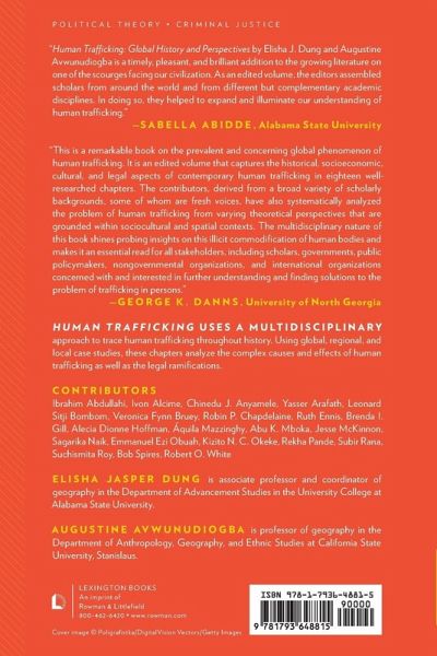 Part 1: Prologue Introduction: Theorizing Human Trafficking Chapter 1: Globalizing Forces and Human Trafficking Abu K. Mboka Chapter 2: Recalibrating Moral Compasses: A Global Conceptual History of Human Trafficking, 1870-2020 Ruth Ennis Chapter 3: Globalization and Commercial Sexual Exploitation of Women's Bodies in India Rekha Pande Chapter 4: Human Trafficking, Antitrafficking, and Contemporary Theory Bob Spires Part 2: Legislations and Conventions Chapter 5: Human Trafficking and the Law in Canada Veronica Fynn Bruey Chapter 6: Liquid Bodies in the Postmodern Era: A Critical Legal Studies Approach to the Problem of Human Trafficking Áquila Mazzinghy Chapter 7: The International Sex Trade and the Global Problem of Sex Trafficking Robert O. White Chapter 8: Combating Global Trafficking in Persons: The Role of the United States Post-September 2001 Emmanuel E. Obuah Part 3: Overview of Regional Undercurrents Chapter 9: The Effect of Climate Change on Human Traf