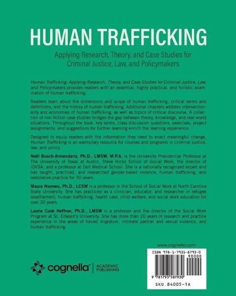 Human Trafficking: Applying Research, Theory, and Case Studies for Criminal Justice, Law, and Policymakers provides readers with an essential, highly practical, and holistic examination of human trafficking. Readers learn about the dimensions and scope of human trafficking, critical terms and definitions, and the history of human trafficking. Additional chapters address intersectionality and economies of human trafficking, as well as topics of critical discourse. A collection of non-fiction case studies bridges the gap between theory, knowledge, and real-world situations. Throughout the book, key terms, class discussion questions, exercises, project assignments, and suggestions for further learning enrich the learning experience. Designed to equip readers with the information they need to enact meaningful change, Human Trafficking is an exemplary resource for courses and programs in criminal justice, law, and policy.