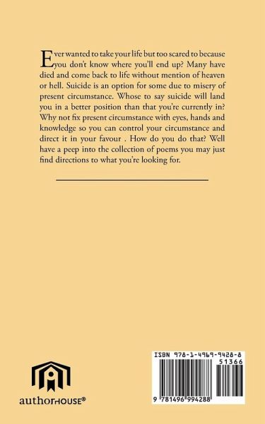 Ever wanted to take your life but too scared to because you don't know where you'll end up? Many have died and come back to life without mention of heaven or hell. Suicide is an option for some due to misery of present circumstance. Whose to say suicide will land you in a better position than that you're currently in? Why not fix present circumstance with eyes, hands and knowledge so you can control your circumstance and direct it in your favour . How do you do that? Well have a peep into the collection of poems you may just find directions to what you're looking for.