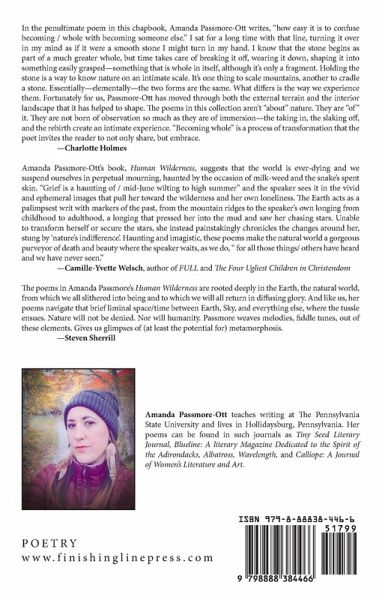 The lyric poems within Human Wilderness explore the trails, parks, and natural landscapes of rural Pennsylvania and the Appalachian Mountains as the author seeks to reconcile the human condition juxtaposed against the natural world. The poems are a longing for the solitude and a belonging within the wilderness and the writer's journey on finding her place as a woman in the wild.