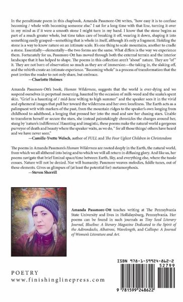 The lyric poems within Human Wilderness explore the trails, parks, and natural landscapes of rural Pennsylvania and the Appalachian Mountains as the author seeks to reconcile the human condition juxtaposed against the natural world. The poems are a longing for the solitude and a belonging within the wilderness and the writer's journey on finding her place as a woman in the wild.