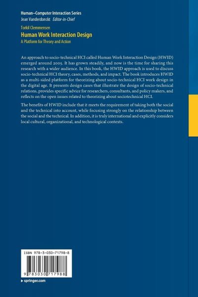 An approach to socio-technical HCI called Human Work Interaction Design (HWID) emerged around 2005. It has grown steadily, and now is the time for sharing this research with a wider audience. In this book, the HWID approach is used to discuss socio-technical HCI theory, cases, methods, and impact. The book introduces HWID as a multi-sided platform for theorizing about socio-technical HCI work design in the digital age. It presents design cases that illustrate the design of socio-technical relations, provides specific advice for researchers, consultants, and policy makers, and reflects on the open issues related to theorizing about sociotechnical HCI.
