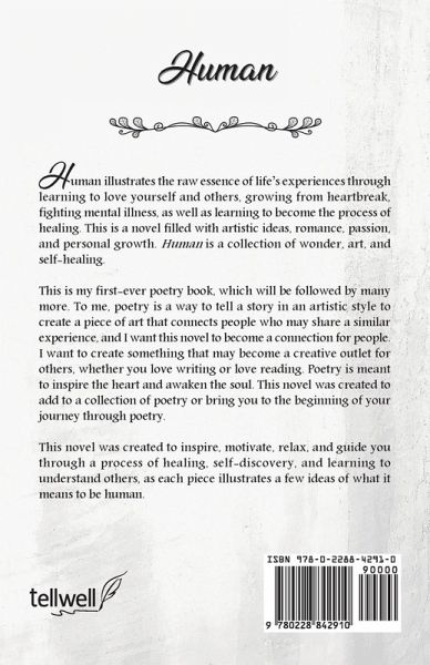 Human illustrates the raw essence of life's experiences through learning to love yourself and others, growing from heartbreak, fighting mental illness, as well as learning to become the process of healing. This is a novel filled with artistic ideas, romance, passion, and personal growth. Human is a collection of wonder, art, and self-healing. This is my first-ever poetry book, which will be followed by many more. To me, poetry is a way to tell a story in an artistic style to create a piece of art that connects people who may share a similar experience, and I want this novel to become a connection for people. I want to create something that may become a creative outlet for others, whether you love writing or love reading. Poetry is meant to inspire the heart and awaken the soul. This novel was created to add to a collection of poetry or bring you to the beginning of your journey through poetry. This novel was created to inspire, motivate, relax, and guide you through a process of healing, self-discovery, and learning to understand others, as each piece illustrates a few ideas of what it means to be human.