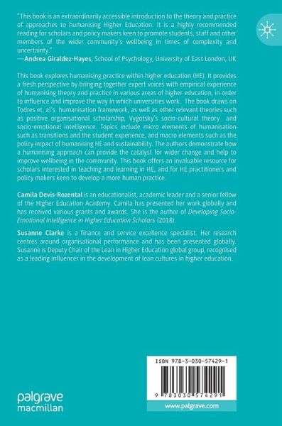 The book draws on Todres et. al's humanisation framework, as well other relevant theories such as positive organisational scholarship, Vygotsky's socio-cultural theory and socio-emotional intelligence. Topics include micro elements of humanisation such as transitions and the student experience, and macro elements such as the policy impact of humanising HE and sustainability. The authors demonstrate how a humanising approach can provide the catalyst for wider change and help to improve wellbeing in the community. This book offers an invaluable resource for scholars interested in teaching and learning in HE, and for HE practitioners and policy makers keen to develop a more human practice.