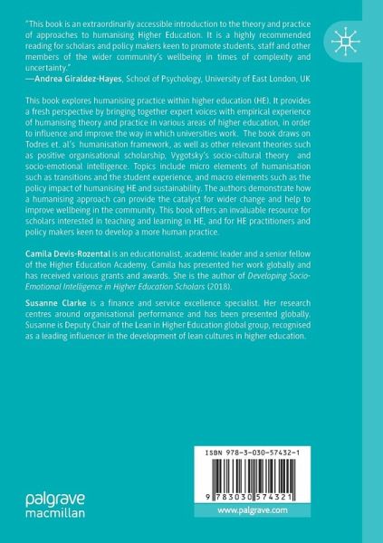 The book draws on Todres et. al's humanisation framework, as well other relevant theories such as positive organisational scholarship, Vygotsky's socio-cultural theory and socio-emotional intelligence. Topics include micro elements of humanisation such as transitions and the student experience, and macro elements such as the policy impact of humanising HE and sustainability. The authors demonstrate how a humanising approach can provide the catalyst for wider change and help to improve wellbeing in the community. This book offers an invaluable resource for scholars interested in teaching and learning in HE, and for HE practitioners and policy makers keen to develop a more human practice.