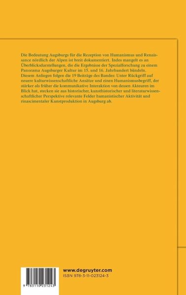 Die Bedeutung Augsburgs für die Rezeption von Humanismus und Renaissance nördlich der Alpen ist breit dokumentiert. Indes mangelt es an Überblicksdarstellungen, die die Ergebnisse der Spezialforschung zu einem Panorama Augsburger Kultur im 15. und 16. Jh. bündeln. Diesem Anliegen folgen die 19 Beiträge des Bandes: Unter Rückgriff auf neuere kulturwissenschaftliche Ansätze und einen Humanismusbegriff, der stärker als früher die kommunikative Interaktion von dessen Akteuren im Blick hat, stecken sie aus historischer, kunsthistorischer und literaturwissenschaftlicher Perspektive relevante Felder humanistischer Aktivität und rinascimentaler Kunstproduktion in Augsburg ab. Dabei deuten sie die Existenz einer untereinander vernetzten Kommunikationsgemeinschaft an, über die die verschiedenen hier vorgestellten humanistischen Aktivitäten in Beziehung zueinander stehen und die diese mit vergleichbaren Zielsetzungen betreibt. Auf diese Weise eröffnet der Band Perspektiven einer weiteren Erschließung humanistischer und rinascimentaler Kultur Augsburgs, die deren spezifische Signatur nicht allein in einem Set typischer Themen und Interessengebiete, sondern insbesondere in diesen gemeinsamen Funktionen und Wirkabsichten suchen sollte.