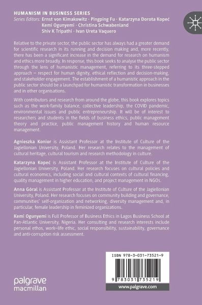 Relative to the private sector, the public sector has always had a greater demand for scientific research in its running and decision making and, more recently, there has been a significant increase in the demand for research on humanism and ethics more broadly. In response, this book seeks to analyse the public sector through the lens of humanistic management, referring to its three-stepped approach - respect for human dignity, ethical reflection and decision-making, and stakeholder engagement. The establishment of a humanistic approach in the public sector should be a launchpad for humanistic transformation in businesses and in other organisations.