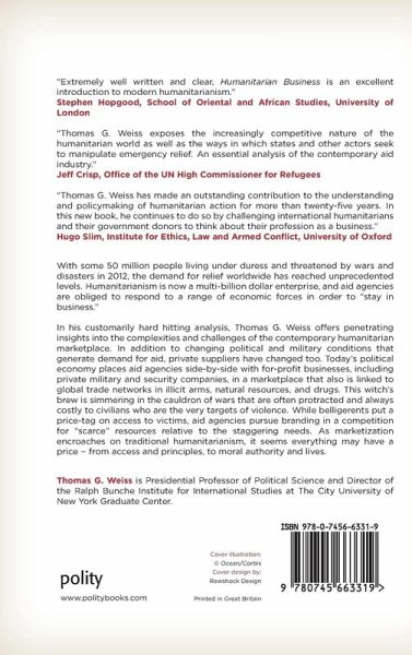 With some 50 million people living under duress and threatened by wars and disasters in 2012, the demand for relief worldwide has reached unprecedented levels. Humanitarianism is now a multi-billion dollar enterprise, and aid agencies are obliged to respond to a range of economic forces in order to 'stay in business'. In his customarily hard-hitting analysis, Thomas G. Weiss offers penetrating insights into the complexities and challenges of the contemporary humanitarian marketplace. In addition to changing political and military conditions that generate demand for aid, private suppliers have changed too. Today's political economy places aid agencies side-by-side with for-profit businesses, including private military and security companies, in a marketplace that also is linked to global trade networks in illicit arms, natural resources, and drugs. This witch's brew is simmering in the cauldron of wars that are often protracted and always costly to civilians who are the very targets of violence. While belligerents put a price-tag on access to victims, aid agencies pursue branding in a competition for 'scarce' resources relative to the staggering needs. As marketization encroaches on traditional humanitarianism, it seems everything may have a priceÑfrom access and principles, to moral authority and lives.