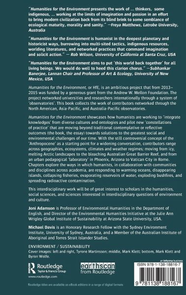 Humanities for the Environment, or HfE, is an ambitious project that from 2013-2015 was funded by a generous grant from the Andrew W. Mellon Foundation. The project networked universities and researchers internationally through a system of "Observatories." This book collects the work of contributors networked through the North American, Asia-Pacific, and Australia-Pacific Observatories. Humanities for the Environment showcases how humanists are working to "integrate knowledges" from diverse cultures and ontologies and pilot new "constellations of practice" that are moving beyond traditional contemplative or reflective outcomes (the book, the essay) towards solutions to the greatest social and environmental challenges of our time. With the still controversial concept of the "Anthropocene" as a starting point for a widening conversation, contributors range across geographies, ecosystems, climates and weather regimes; moving from icy, melting Arctic landscapes to the bleaching Australian Great Barrier Reef, and from an urban pedagogical "laboratory" in Phoenix, Arizona to Vatican City in Rome. Chapters explore the ways in which humanists,¿in collaboration with local communities, NGOs, nonprofits, international science research platforms and disciplines across academia,¿are responding to warming oceans, disappearing islands, collapsing fisheries, evaporating reservoirs of water, exploding bushfires, and spreading radioactive contamination. This interdisciplinary work will be of great interest to scholars in the humanities, social sciences, and sciences interested in interdisciplinary questions of environment and culture.