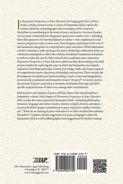 In Humanities Perspectives in Peace Education: Re-Engaging the Heart of Peace Studies, scholar-teachers across a variety of humanities fields explore the content, methods, and pedagogies that are unique to their respective disciplines in contributing to the study of peace and justice. In recent decades, even as peace scholarship has burgeoned, many peace studies texts-including those that purport to be interdisciplinary in nature-have emphasized social science perspectives and, in some cases, have foregone exploration of the role of the humanities altogether in comprehensive peace education. While humanities scholars continue to stake out space for peace scholarship within their fields, no volume has attempted to collect the wisdom of multiple humanities disciplines in order to make the case for their critical role in authentic peace education. Humanities Perspectives in Peace Education addresses that shortcoming in the field of peace studies by exploring the ways in which the humanities are uniquely situated to contribute particular content, knowledge, skills, and values required of comprehensive peace education, scholarship, and activism. These include the development of empathy and understanding, creative vision and imagination, personal and communal transformation toward "the good" in society (such as the pursuit of justice, nonviolence, freedom, and human thriving), and field-specific analytical lenses of their own, among other contributions. Both teachers and students of peace will find value in this interdisciplinary humanities volume. Each chapter of Humanities Perspectives in Peace Education offers a deep-dive into a particular humanities field-including philosophy, literature, language and culture studies, rhetoric, religion, history, and music-to mine the field's unique contributions to peace and justice studies. Scholars ask: "What are we missing in peace education if we fail to include this academic discipline?" Chapters include suggestions for peace pedagogies within the humanities field as well as bibliographies and suggestions for further reading.