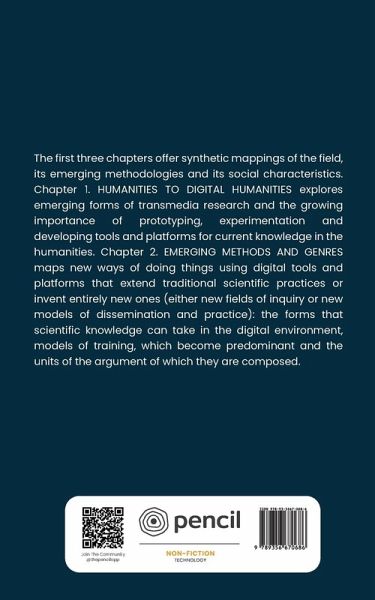 The first three chapters offer synthetic mappings of the field, its emerging methodologies and its social characteristics. Chapter 1. HUMANITIES TO DIGITAL HUMANITIES explores emerging forms of transmedia research and the growing importance of prototyping, experimentation and developing tools and platforms for current knowledge in the humanities. Chapter 2. EMERGING METHODS AND GENRES maps new ways of doing things using digital tools and platforms that extend traditional scientific practices or invent entirely new ones (either new fields of inquiry or new models of dissemination and practice): the forms that scientific knowledge can take in the digital environment, models of training, which become predominant and the units of the argument of which they are composed.
