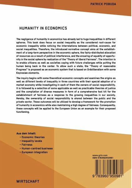 The negligence of humanity in economics has already led to huge inequalities in different spheres. This book does focus on social inequality as the considered root-cause for economic inequality while noticing the interrelations between political, economic, and social inequalities. Therefore, the introduced normative concept aims at the establishment of a long-term perspective in the economic sphere, the fairly-distributed allocation of resources as a result of political interference, and the ensuring of equality of opportunity in the social sphere by realization of the "Theory of liberal Fairness". The intention is to enable citizens as well as societies coping with future challenges while putting the human being back in the center. To allow such a state, the "Theory of reasonable Progress" is proposed as an economic system that is based on Ordoliberalism with some Keynesian elements.The inquiry begins with some theoretical economic concepts and examines the origins as well as different levels of inequality in three countries with their special adoption of a market economy while investigating in each of them the owners of social responsibility. It is followed by a selection of some applicable as well as practicable theories of justice and the compilation of diverse measures in form of a comprehensive tool kit for the establishment of fairness as a response to the growing inequalities in our society. Hereby, the ownership of social responsibility is shared between the public and the private sector. These outcomes will be utilized to develop a framework for the promotion of humanity in economics while also maintaining a high degree of fairness. Consequently, these concepts will be applied to the European Union as an example for their proposed functioning.From the text:- Economic theories;- Inequality levels;- Fairness;- Human-centred business;- European integration