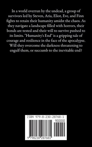In a world overrun by the undead, a group of survivors led by Steven, Aria, Eliot, Eve, and Finn fights to retain their humanity amidst the chaos. As they navigate a landscape filled with horrors, their bonds are tested and their will to survive pushed to its limits. "Humanity's End" is a gripping tale of courage and resilience in the face of the apocalypse. Will they overcome the darkness threatening to engulf them, or succumb to the inevitable end?