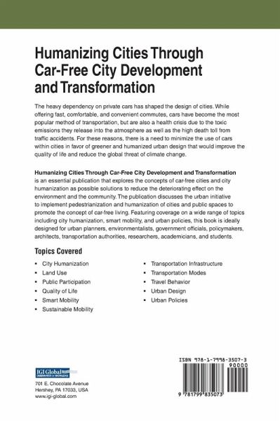 The heavy dependency on private cars has shaped the design of cities. While offering fast, comfortable, and convenient commutes, cars have become the most popular method of transportation, but are also a health crisis due to the toxic emissions they release into the atmosphere as well as the high death toll from traffic accidents. For these reasons, there is a need to minimize the use of cars within cities in favor of greener and humanized urban design that would improve the quality of life and reduce the global threat of climate change. Humanizing Cities Through Car-Free City Development and Transformation is an essential publication that explores the concepts of car-free cities and city humanization as possible solutions to reduce the deteriorating effect on the environment and the community. The publication discusses the urban initiative to implement pedestrianization and humanization of cities and public spaces to promote the concept of car-free living. Featuring coverage on a wide range of topics including city humanization, smart mobility, and urban policies, this book is ideally designed for urban planners, environmentalists, government officials, policymakers, architects, transportation authorities, researchers, academicians, and students.
