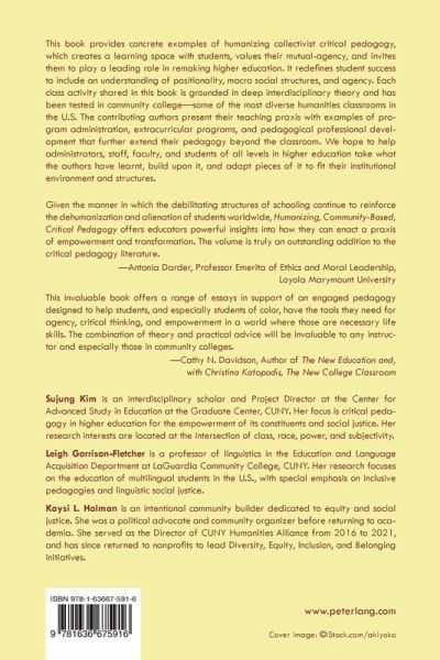 This book provides concrete examples of humanizing collectivist critical pedagogy, which creates a learning space with students, values their mutual-agency, and invites them to play a leading role in remaking higher education. It redefines student success to include an understanding of positionality, macro social structures, and agency. Each class activity shared in this book is grounded in deep interdisciplinary theory and has been tested in community college-some of the most diverse humanities classrooms in the U.S. The contributing authors present their teaching praxis with examples of program administration, extracurricular programs, and pedagogical professional development that further extend their pedagogy beyond the classroom. We hope to help administrators, staff, faculty, and students of all levels in higher education take what the authors have learnt, build upon it, and adapt pieces of it to fi t their institutional environment and structures.