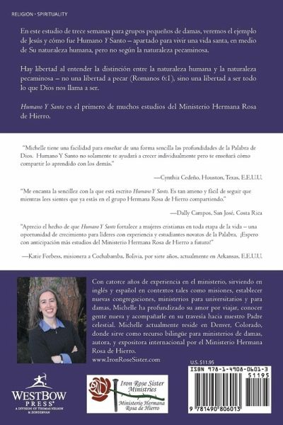 En este estudio de trece semanas para grupos pequeños de damas, veremos el ejemplo de Jesús y cómo fue Humano Y Santo - apartado para vivir una vida santa, en medio de Su naturaleza humana, pero no según la naturaleza pecaminosa. Hay libertad al entender la distinción entre la naturaleza humana y la naturaleza pecaminosa - no una libertad a pecar (Romanos 6:1), sino una libertad a ser todo lo que Dios nos llama a ser. Humano Y Santo es el primero de muchos estudios del Ministerio Hermana Rosa de Hierro. "Michelle tiene una facilidad para enseñar de una forma sencilla las profundidades de la Palabra de Dios. Humano Y Santo no solamente te ayudará a crecer individualmente pero te enseñará cómo compartir lo aprendido con los demás." -Cynthia Cedeño, Houston, Texas, E.E.U.U. "Me encanta la sencillez con la que está escrito Humano Y Santo. Es tan ameno y fácil de seguir que mientras lees sientes que ya estás en el grupo Hermana Rosa de Hierro compartiendo." -Dally Campos, San José, Costa Rica "Aprecio el hecho de que Humano Y Santo fortalece a mujeres cristianas en toda etapa de la vida - una oportunidad de crecimiento para líderes con experiencia y estudiantes novatos de la Palabra. ¡Espero con anticipación más estudios del Ministerio Hermana Rosa de Hierro a futuro!" -Katie Forbess, misionera a Cochabamba, Bolivia, por siete años, actualmente en Arkansas, E.E.U.U.