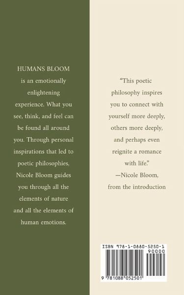 What you see is what you feel. Every day is an experience to feel nothing, something, or everything. There is more to feel in life than meets the eye. Who we are is not all that we are, and all that we are is all around us. Humans Bloom inspires you to understand and evolve your emotions, experiences, and relationships in life by connecting to profound perspectives of nature. There is power, peace, purpose, compassion, beauty, love, and truth to be felt in this poetic philosophy. Maybe this book changes your life or just your point of view. But every page is a chance to open your playful heart to the possibilities of you, a chance to bloom.