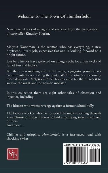 Humberfield is a quiet village, most people go about their day to day business and getting along with lives. But some residents have secrets, revenge on their minds and a need to set things right in their lives, no matter the cost to others... But sometimes, people are just in the wrong place at the wrong time. Like Melyssa Woodman, she is the woman who has everything, a new boyfriend, lovely job, expensive flat and looking forward to a bright future. Her best friends have gathered on a huge yacht for a weekend of fun and frolics. But there is something else in the water, a gigantic primeval sea creature intent on crashing the party. With the situation becoming more desperate, Melyssa and her friends must try their hardest to survive the night and the aquatic monster. In this collection, there are eight other tales of obsession and injustice, including: The factory worker who has to spend the night searching through a warehouse of fridge freezers to find a terrifying secret inside one of them. And more... From the mind of storyteller Kingsley Pilgrim, 'Humberfield' is a fast paced read. Intriguing and full of suspense and twists The tales are dark, but not horror, not sci- fi, not supernatural.