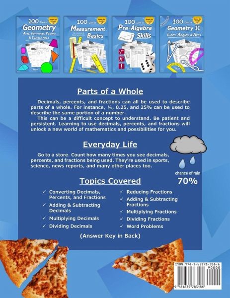 100 days of practice problems for decimals, percents, and fractions. This is not an entry level book. Students will need basic understanding of what fractions and decimals are. This book focuses on converting between fractions, decimals, and percentages. It also teaches students how to add, subtract, multiply, and divide decimals and fractions. It's a great resource for upper elementary, middle school, and early high school students (KS2, KS3).