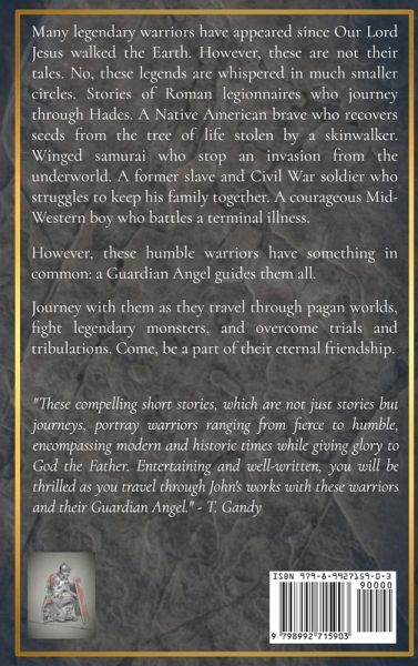 Many legendary warriors have appeared since Our Lord Jesus walked the Earth. However, these are not their tales. No, these legends are whispered in much smaller circles. Stories of Roman legionnaires who journey through Hades. A Native American brave who recovers seeds from the tree of life stolen by a skinwalker. Winged samurai who stop an invasion from the underworld. A former slave and Civil War soldier who struggles to keep his family together. A courageous Mid-Western boy who battles a terminal illness. However, these humble warriors have something in common: a Guardian Angel guides them all. Journey with them as they travel through pagan worlds, fight legendary monsters, and overcome trials and tribulations. Come, be a part of their eternal friendship.