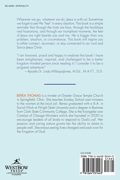 Wherever we go, whatever we do, Jesus is with us! Sometimes we forget to see His "feet" in every situation. This book is a simple reminder that through the trials we face, through the hardships and frustrations, and through our triumphant moments, the feet of Jesus are right beside you and me. He is bigger than any problem, situation, or circumstance. This book will inspire you to either connect, reconnect, or stay connected to our Lord and Savior Jesus Christ. "I am honored, proud and happy to endorse this book! I have been enlightened, inspired, and challenged to be a better kingdom minded person since reading it! I consider it to be a poignant adventure!" -Apostle Dr. Linda Millsaps-Jones, M.Ed., M.A.P.T., D.D.